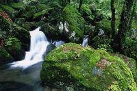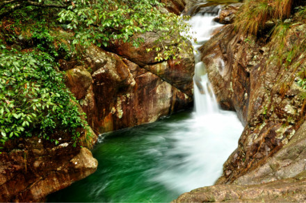 牯牛降雨量充沛,溪流縱橫,溪水常流不斷,潺潺流水,從山頂淙淙而下,遇有石壁斷崖,飛瀉直下形成一道道水瀑,大的如銀河落九天,空谷轟鳴,水汽升騰;小的似白練輕垂,涓涓細(xì)流,如泣如訴。十步一小瀑,百步一大瀑,飛瀑相連,蔚為壯觀。溪流碧綠清澈,時深時淺,時緩時急,在山間林里穿行,每遇石凼平地,則形成一個個大小不一的清潭,晶瑩剔透,異彩紛呈,如同一塊塊翡翠,每至雨季,潭瀑相應(yīng),山色朦朧,如一幅幅墨染的山水圖畫。