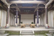 前廳是整幢房子中最精華的部分,大門后面聳立著一幅威儀的中門,在中門“!弊值纳戏,鑲有一幅木雕“百子鬧元宵”圖,圖上雕刻著100個小男孩過元宵鬧花燈時的情景,這正是古代“多子多福”傳統(tǒng)觀念的生動寫照,“百子鬧元宵”圖兩邊的“商”字斗拱上則分別雕有四出《三國演義》的戲文,斗拱的上方雕有“南、北”財(cái)神,“南、北”財(cái)神的上方是閣樓護(hù)板,在此,汪定貴設(shè)計(jì)了“漁、樵、耕、讀”四根木雕立柱,分別代表了古代的四種職業(yè)。