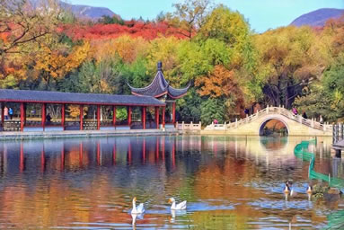 小江南:湖水面積16308平方米,湖邊小橋、挑臺(tái)、駁岸小路曲折。