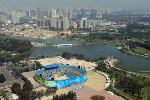 朝陽公園沙灘排球場是北京奧運(yùn)會臨時場館之一,位于朝陽公園北部原煤氣用具廠舊址,由中建國際設(shè)計顧問有限責(zé)任公司設(shè)計。整個比賽用地包括一個主比賽場、兩塊熱身場和六塊訓(xùn)練場,共設(shè)觀眾席位12000個,項目規(guī)劃占地面積184500平方米,建設(shè)用地面積150003平方米,總建筑面積14169平方米。包括一個住比賽場、兩塊熱身場、六塊訓(xùn)練場和三座附屬功能用房,主賽場結(jié)構(gòu)為管架式鋼結(jié)構(gòu)。綠化面積達(dá)70%以上,是占地面積最大、綠化面積最廣的場館之一。沙灘排球場館跟“鳥巢”一樣,都屬于鋼結(jié)構(gòu)建筑,用鋼量達(dá)2400噸。由于它形似“燕窩”,于是就有北有“鳥巢”、東有“燕窩”的戲說。