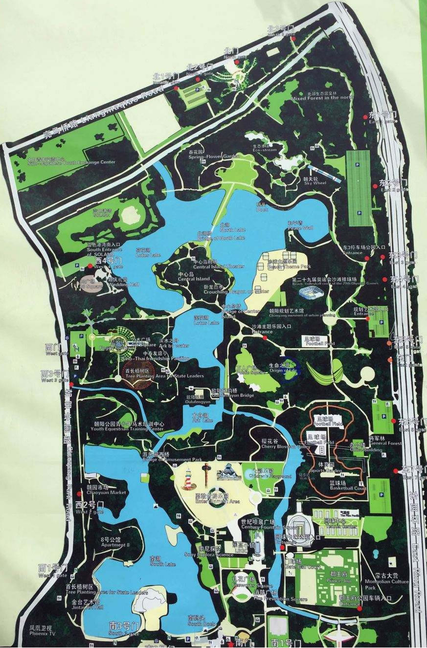 朝陽公園建成的景點有中央首長植樹林、將軍林、世界語林、國際友誼林、層林浩渺、水上游覽區(qū)、南門景區(qū)、勇敢者天地游樂園、歐陸風(fēng)韻、綠茵歡歌、生命之源、藝術(shù)廣場、濱水之洲、生態(tài)水溪等20余個景區(qū)、景點。