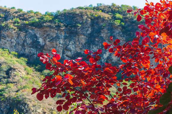 坡峰嶺景區(qū)春天時(shí)黃櫨花開(kāi),"三千粉色,花明如繡",滿(mǎn)樹(shù)毛絨的粉紅色黃櫨花傾灑在山谷中,層層迭迭,如粉色霧靄,置身其中如夢(mèng)似幻。秋天時(shí)漫山紅葉,"紅葉綠中游,彩練當(dāng)空舞",種類(lèi)豐富的植物資源使這里成為流動(dòng)的色彩海洋,猶如一幅波瀾壯闊的紅葉畫(huà)卷。