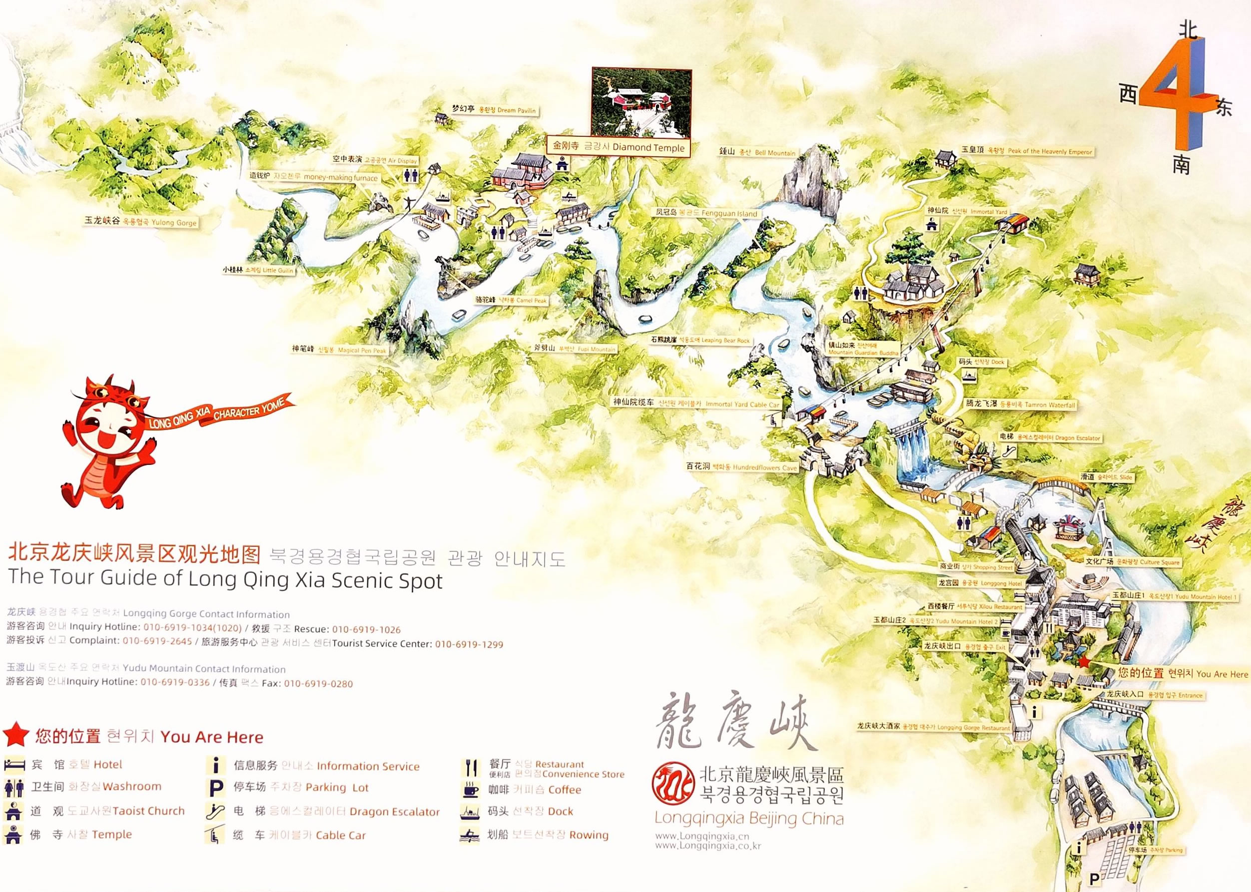 1986年北京評選十六景,得票居第十位,取其古地名兼寓龍騰之意,定名“龍慶峽”。龍慶峽南面為八達(dá)嶺長城,西北為松山森林公園,正西是海坨山。7月份平均氣溫比延慶縣城低2.9度,比北京城區(qū)低6.4度。在已開放游覽的7公里長的庫區(qū),共有20-30處景觀。游船駛抵“九曲湖”的一座小碼頭,可以棄舟登岸,沿山谷步行而上,有神仙院、仙人棋、老虎嘴等景點(diǎn)。
