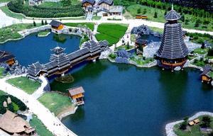 侗族建筑:侗族建筑景區(qū)占地4000平方米,建筑面積571平方米,建筑復(fù)原按貴州省從江、黎平地區(qū)的侗族典型建筑。規(guī)劃形式為寨,由鼓樓、風(fēng)雨橋、寨門、戲臺(tái)、民居、水車、碾房、谷倉(cāng)、稻田等組成。侗族建筑以杉木為原料,民居形式為干欄式。