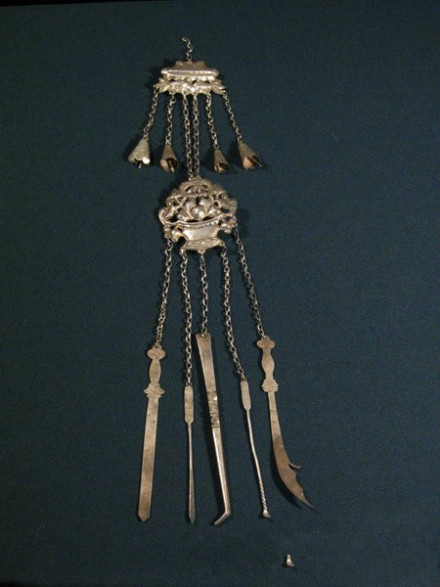 中華民族園收藏著上千枚中華各民族銀飾。大到鳳冠,銀衣、銀角、銀項(xiàng)圈,小如簪釵、戒指、耳環(huán)、銀扣琳瑯滿目,其中不乏明代、清代珍品。征集于北京、貴州、廣西、湖南、 山西、山東、陜西等地?缭綍r(shí)間有上千年之久。