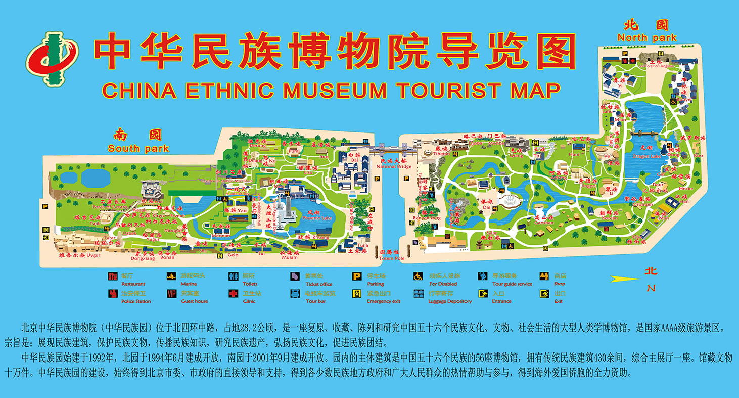 北京中華民族園,是集中國(guó)少數(shù)民族的傳統(tǒng)建筑、民族風(fēng)情,歌舞表演,工藝制作以及民族美食為一體的大型民族文化園地。園內(nèi)建有國(guó)內(nèi)最大伯鑄鐵雕塑以及仿真的熱帶榕樹(shù)林、水中溶洞,土林、盤龍瀑布,滄源巖畫、阿里山神木等。南園也已建成完畢,主要有民族博物館和雕塑廣場(chǎng)等大型設(shè)施,以及二十余個(gè)民族村寨。