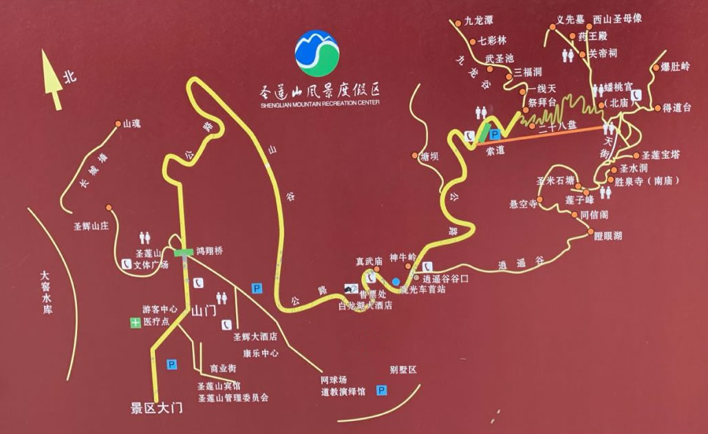圣蓮山景區(qū)海拔1030米,屬暖溫帶半濕潤,半干旱大陸性季風氣候,四季特征明顯,夏季涼爽怡人,冬季霧鎖迎客松,平均氣溫10℃。7月氣溫最高,平均氣溫24℃。植被垂直分布,分別為溫帶闊葉林、鵝耳櫪萌生叢和荊條灌叢,以九龍谷生態(tài)溝尤為顯著。野生動物有哺乳類、鳥類、爬行類和兩棲類,其中,斑羚、豺、赤狐、紅腳隼、禿鷲、蒼鷹等均為國家級保護動物。為了便于游覽獨特的地質遺跡,景區(qū)建成包括綜合服務區(qū)、典型地質遺跡觀賞區(qū)、“圣米”觀賞區(qū)、巖洞洞穴游覽區(qū)、地表巖溶地貌觀賞區(qū)以及人文景觀區(qū)6個游覽觀賞區(qū)的市級地質公園。主要景觀有山門、神牛嶺、佛椅山、斑馬石、三碰水、檀香茶舍、祭拜臺、九龍谷、翠屏峰、二十八盤道、鷂子翻身、蟠桃宮、九蓮洞、三清殿、古真堂、打坐臺、八仙洞、天街、蔡義先墓、李娘子宅、長春洞、關帝祠、西山圣母、通天洞、夏日觀雪、長星觀、萬仙洞、圣水洞、圣米石塘、望鄉(xiāng)亭、南天門、百里臥佛、圣蓮寶塔、古碾房、杏林塔院、逍遙谷、天生橋、閻王爺鼻子、晾馬臺、古松、迎客松等。
