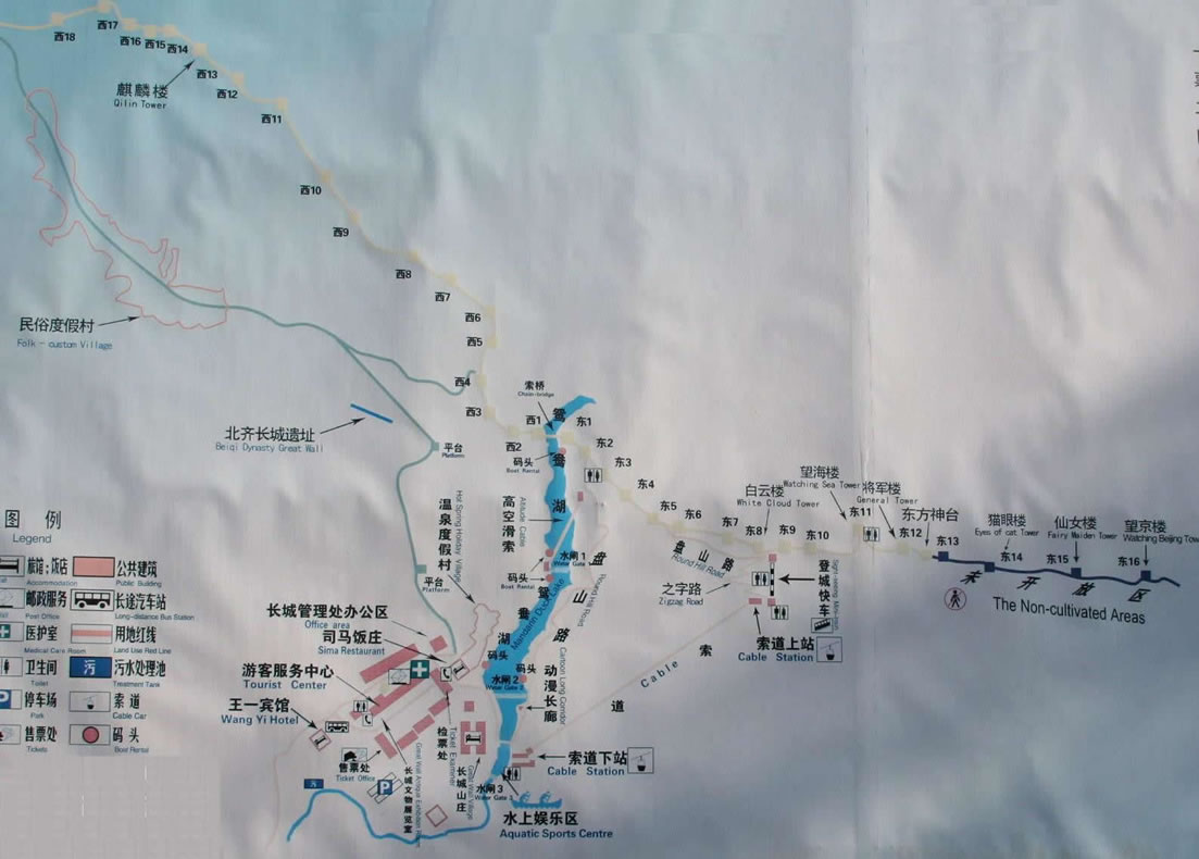 以水庫為界,以東的部分長(zhǎng)城為東段長(zhǎng)城,以西的部分為西段長(zhǎng)城,徒步登上司馬臺(tái)長(zhǎng)城東段第一個(gè)敵樓東一樓,在山下望司馬臺(tái)長(zhǎng)城,只見它背倚藍(lán)天,橫亙東西,野云悠悠,極高極險(xiǎn)。其山勢(shì)猶如人的手指并攏,呈雙向階梯狀。若從西面登上長(zhǎng)城,側(cè)向看去,唯有一峰在上,仿佛只要奮力爬上,便可居高臨下。但一旦登上第一個(gè)峰頂?shù)臄硺,轉(zhuǎn)身東望,卻又有一峰逼面。當(dāng)?shù)巧系诙䝼(gè)山頭的敵樓,仰頭東望,還有更高一峰在上;而低頭下望,只見第一個(gè)山頭上的敵樓全被掩住,真?zhèn)是“前不見古人,后不見來者!钡巧系谒膫(gè)敵樓,眼下開闊起來,遠(yuǎn)處的村莊冒著溫馨的炊煙,顯得恬靜、悠然。