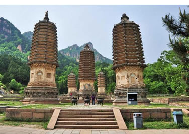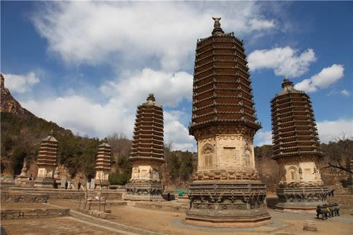 銀山塔林位于銀山南麓,現(xiàn)存17座墓塔,大小高矮不等,高者20余米,直徑達(dá)7米左右,矮者只有兩三米高。從塔的形制上看,大體上可分為兩大類:一為密檐式塔,二是覆缽式塔。這里保存的幾座大型墓塔全部是密檐式結(jié)構(gòu),是北京地區(qū)保存最好、最為集中的密檐式塔群。有六角形和八角形兩種,都是仿木結(jié)構(gòu)的密檐式磚塔。塔身自下而上逐層遞減,塔的高度不等,最高的佛覺禪師塔高22.8米。造型最為精美的是懿行大師塔,是典型的金代作品。塔高18米,平面為八角形,塔基由須彌座和斗拱勾欄平座組成,須彌座雕有獅頭寶瓶等紋飾,整個塔基除斗拱外,滿布花紋,雕刻繁縟,頗具匠心。仰蓮之上為塔身,塔身八隅旋圓柱,頂端砌以闌額普相枋,檐下每間補(bǔ)間旋施斗拱一朵,單抄四輔作。塔身四面辟假門,其余四面辟方形假窗。塔共拔檐13層,每層用疊澀手法向外砌出五層,代替檐椽,逐層收減,呈現(xiàn)出豐滿有力的卷殺。
