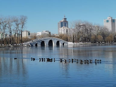 引水湖在公園東北部,有一幽靜湖區(qū),原來為林木囤養(yǎng)區(qū),植被繁茂。隨著公園環(huán)路的建設(shè),這個(gè)占地9.5公頃,地勢(shì)低洼的林區(qū),在1997、1998年被大規(guī)模回填改造。該景區(qū)的水系是自東湖而來,至釣魚臺(tái)而去。北部地形舒緩開闊,以雪松,銀杏和挺拔的白楊等喬木為主,散布于開闊的草坪,沿公園環(huán)湖路北,配以海棠等春花灌木帶,極具90年代的疏林草地風(fēng)格。