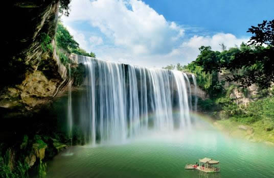 萬州大瀑布又稱青龍瀑布、甘寧瀑布。位于核心景區(qū)青龍河中段,寬151米,高64.5米,單掛面積9739.5平方米,為迄今發(fā)現(xiàn)的亞洲面積最大的單掛瀑布。瀑布長年浩浩蕩蕩,凌空飛瀉,其勢如千軍萬馬橫空出世,氣吞萬象。在陽光的照射下,瀑珠時時生輝,瀑霧處處成虹。隨著水勢大小、陽光強弱、觀賞角度的變換,彩虹的位置、形態(tài)、色澤還會發(fā)生奇異的變化,形成“飛瀑斜虹”“臥波長虹”“雙曲彩虹”“跨岸飛虹”“水簾霓虹”“飲洞巨虹”等美景。
