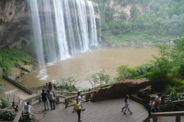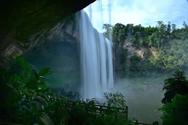 水簾洞位于瀑布下方,由整塊的巨巖組成。巨巖由砂巖青石構成,面積有上萬平方米。水簾洞內(nèi)能以360度的全景視角觀賞到大瀑布“飛流直下三千尺,疑是銀河落九天”的恢宏氣勢,體驗與瀑布親密接觸的清爽,領略春雨瀟瀟、秋雨綿綿、夏雨磅礴的四季風雨情致,有奇妙的季節(jié)穿越之感。