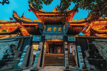 天子殿座西向東,最早修建于西晉,已有1600多年歷史,現(xiàn)存的天子殿是清康熙三年(1663年)重修的,已有三百多年歷史。全殿占地2431平方米,由牌坊、山門、殿堂三部分組成,對稱地排列在一條中軸線上。牌坊為木石結(jié)構(gòu)的三重檐坊,高約10公尺,山門為重檐歇山式屋頂,兩邊的鐘鼓樓均為四角攢尖頂,殿堂為磚木結(jié)構(gòu),硬山式屋頂,穿逗式梁架。該殿系鬼城的核心部分,也是名山上建筑年代最久,面積、規(guī)模最大,保存最完整的一座廟宇。