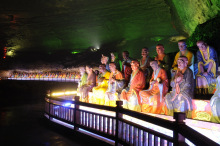 大寶洞位于三泉鎮(zhèn)大寶山上,海拔960米,洞口呈半月形,高2.5米,寬16米。洞分兩層,下層長500余米,有天然門道,分為前、中、后三部分,有石室精舍、頂天女媧、鎮(zhèn)寶靈象、海底世界、佛主講經(jīng)、天外來客、赧顏石猴等景點。