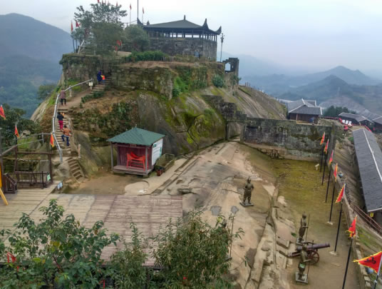 滑石寨位于金帶鎮(zhèn)滑石村3組,是平壩上突兀拔起的一座高260多米的孤峰。孤峰呈紡錘形,四周皆是懸崖峭壁,峰頂平地有6000平方米左右。峰西是一堵傾斜約75度、近10萬(wàn)平方米的完整石壁,石壁上鑿有一條寬不盈尺的之字形石階,它是通達(dá)寨上的惟一路徑。從山下到寨上要走1個(gè)多小時(shí)路程,其中要經(jīng)過(guò)2000多級(jí)在石壁上開(kāi)鑿的石階,山腰到山頂分別有兩道寨門把守。記者在現(xiàn)場(chǎng)看到,山腰一道寨門門楣上清晰刻寫著“未雨,嘉慶二年十月立”字樣。登上寨頂,數(shù)十間木質(zhì)結(jié)構(gòu)的房瓦痕跡依稀可見(jiàn),青石砌的寨門和寨堡仍保存完好,四道墻體上都開(kāi)有射擊孔。整個(gè)寨堡耗石約1萬(wàn)多方,工程浩大,令人稱奇。