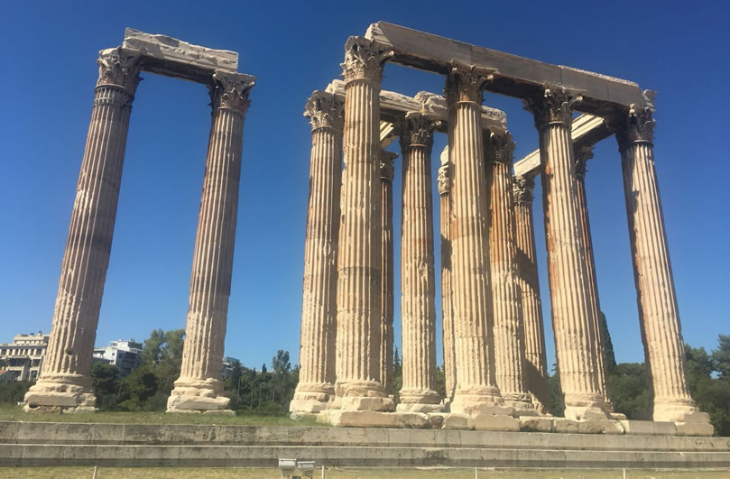 宙斯神廟 宙斯神廟位于希臘雅典衛(wèi)城東南面,是為了祭祀宙斯而建的,也是古希臘最大的神廟。宙斯神廟建于公元前470年,于公元前456年完工,由建筑師Libon設(shè)計(jì),宙斯神像則由雕刻家菲狄亞斯負(fù)責(zé)。直到公元前86年,羅馬指揮官蘇拉(Sulla)攻占雅典,破壞了尚未完成的建筑,將一部分石柱和其他建材拆下來(lái)之后,運(yùn)到羅馬。直到今天,在羅馬市中心的古羅馬廣場(chǎng)遺址上,還能看見它們。宙斯廟尤以象牙和黃金的塑像而聞名于世。 宙斯神廟是伊奧尼亞風(fēng)格的建筑,后來(lái)改用了科林斯式石柱風(fēng)格,而且一概使用大理石。整個(gè)建筑坐落在一塊205米長(zhǎng),130米寬的地基上,神廟本身長(zhǎng)107.75米,寬41米,共有104根科林斯柱。每根石柱高達(dá)17.25米,頂端直徑達(dá)1.3米,約計(jì)用大理石1.55萬(wàn)噸。和眾多的古希臘神廟一樣,宙斯神廟也遭受嚴(yán)重的破壞,104根柱子中僅存13根。宙斯神廟和哈德良拱門隔路相望,宙斯神廟位于路南,而哈德良拱門則位于路北,這兩座建筑都是由距今1900多年前的羅馬帝國(guó)國(guó)王哈德良時(shí)期修建的。我們已經(jīng)無(wú)法看到宙斯神廟和哈德良拱門的原始形態(tài),只能通過(guò)斷壁殘?jiān)珌?lái)回憶當(dāng)時(shí)的輝煌。