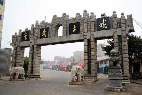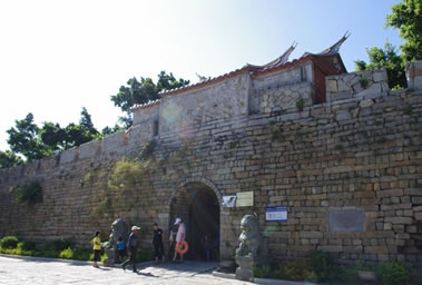 城內(nèi)有四個城門,南北門相距約500多米,東西門相距約300多米。東、西、北三座城門相似,各有兩道城門,外加筑月城,上建城樓,城門上各設烽火臺一座,南城門則外加設一照墻,照墻前有一尊關公雕像。相傳當年倭寇炮轟城池,城內(nèi)關帝廟的關云長把青龍偃月刀一揮,炮彈被撥落在城墻旁,再一揮,炮彈射回賊船,于是船沉寇亡。西門的兩道城門如今依舊完好地保留下來。蔭涼的城門下擺有幾個小攤子。城內(nèi)的十字大街聯(lián)結(jié)著四個城門,街道則由一塊塊石板鋪就而成。