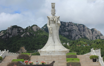 太姥娘娘雕像左邊是烏龍崗,右邊是虎頭崗,前眺東海,幜袓u,背靠摩霄峰。雕像由288塊花崗巖組成,疊高18層,高20.88米(含基座),臺階的臺數(shù)、級數(shù),都暗合道教所推崇的數(shù)字“九”。雕像造型方中有圓,以方為主,吸收了北魏石窟雕像的秀骨清相的特點,揉進少許盛唐時代人物面部的豐潤,同時又從漢俑中吸取單純簡潔之韻味。