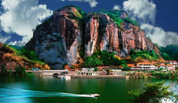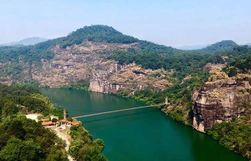 桃源洞因盛產(chǎn)栟櫚樹,古有栟櫚山之稱。風(fēng)景區(qū)起始于唐代,五代后晉年間建有寺廟,到了明代風(fēng)景區(qū)得到較大的發(fā)展。南宋宰相李綱和左正言鄧肅及明代大旅行家徐霞客都曾在此駐足并留有詩句。明代萬歷年間(公元1605年)當(dāng)?shù)匕采叭藘煽に抉R陳源湛捐資建有亭、臺(tái)、樓、閣十余處,取“世外桃源”之意改名為桃源洞,并在入口處120米高的赤壁上刻有“桃源洞口”四個(gè)大字,從此桃源洞名聞遐邇。這里丹霞地貌形成了眾多的奇峰峭壁,綠海林濤和碧水丹山。
