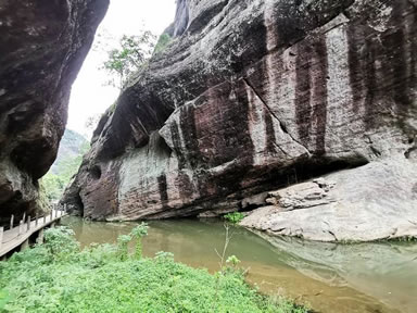 特殊地貌形成兩邊懸崖對(duì)峙,這條小澗叫桃花澗,從景區(qū)深處流出,我們的游路也將沿著高山峽谷的縫隙向內(nèi)延伸。桃源洞本沒有“洞”,無論是步行,還是泛舟游覽,都給人一種洞口的感覺右壁的懸崖高達(dá)120米,“桃源洞口”四個(gè)大字刻在36米高處,是明萬歷年間,辭官回永安的名士陳源湛于1605年所題,每字兩米見方。