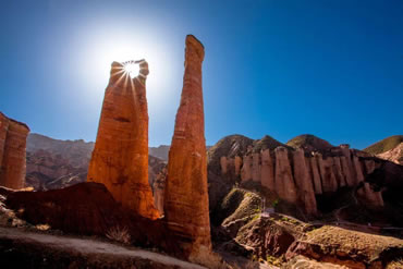 這是冰溝丹霞景區(qū)的又一標(biāo)志性景觀。兩個(gè)并排而立的石柱,高約50米,它是由紫紅色砂巖、礫巖、夾砂礫巖構(gòu)成,在流水沖蝕及凍融風(fēng)化剝蝕等外動(dòng)力作用下,沿著垂直節(jié)理崩塌、解體,使巖墻分割,形成兩個(gè)孤立的直徑不同的石柱,均上細(xì)下粗、上圓下方,說明風(fēng)化作用是自上而下進(jìn)行的.石柱下方還基本保留原始節(jié)理切割地層后留下的棱角,形狀像一對(duì)逼真的男女生殖器官。左側(cè)的石柱為男柱,頂端如蘑菇;右側(cè)的石柱為女柱。