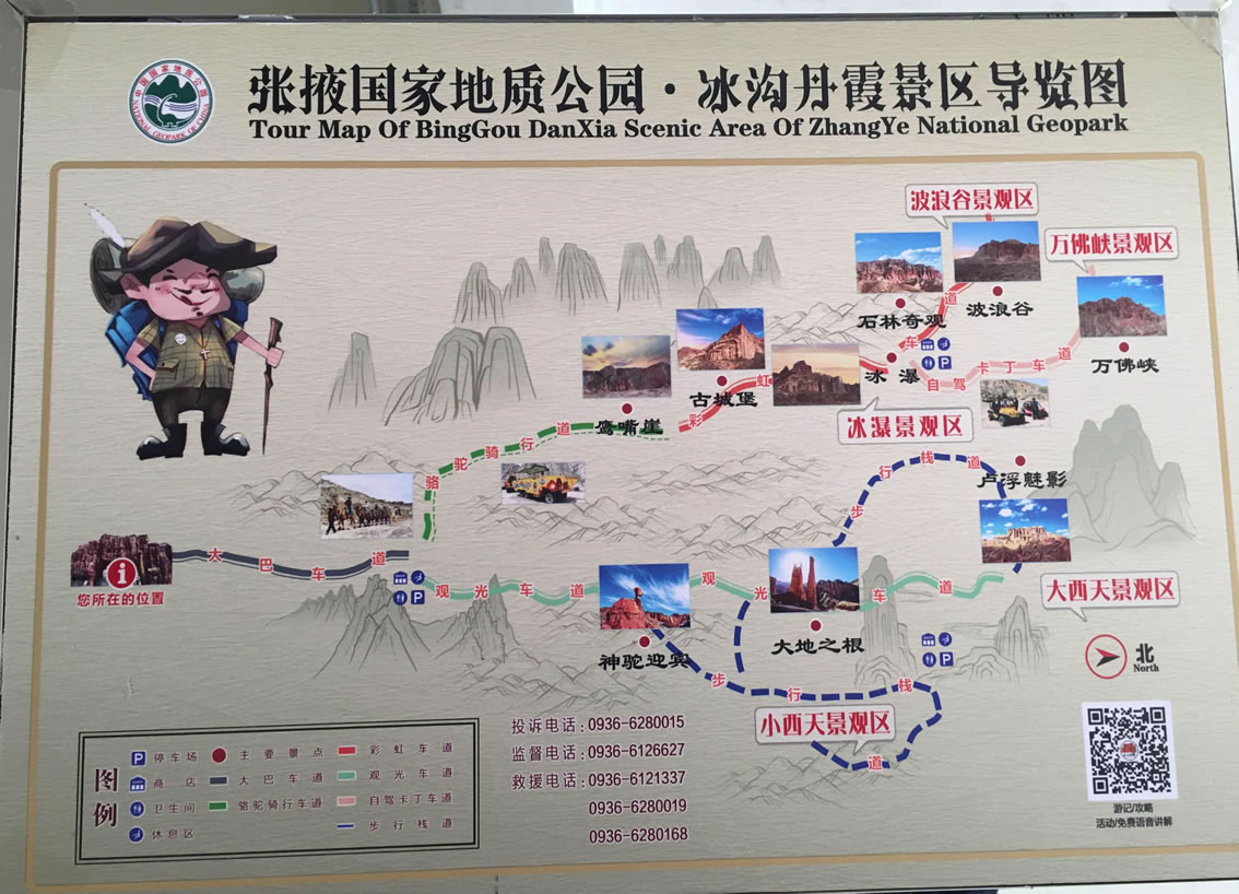 大西天景區(qū)位于冰溝景區(qū)的中部,主要景觀為三個(gè)宮殿式丹霞山體,包括約2公里的游步景段和2公里的公路景段。游覽路線為從游步景段北去后,再?gòu)墓肪岸文匣?形成一個(gè)總長(zhǎng)約4.5公里的環(huán)線,整個(gè)景線需2小時(shí)的游覽時(shí)間。主要景點(diǎn)有祁連火炬(奧運(yùn)火炬、左旋法螺、冰激凌)、鎖陽(yáng)神柱、鷹頭巖、金鴕情深、盧浮魅影(極樂宮)、埃及法老、蘑菇石、毛主席半身像、金蟾觀霞(金蟾望月)、啤酒屋、孔雀石(佛母金剛)、琉璃宮、娑婆宮、神龜探海(赑屃峰)、靈芝臺(tái)、金獅峰(金猊梁)、金剛杵、羊群下山等,其中最有名的當(dāng)屬神龜探海、金駝情深、鎖陽(yáng)神柱、鷹頭巖、埃及法老、盧浮魅影、金蟾觀霞等景觀。