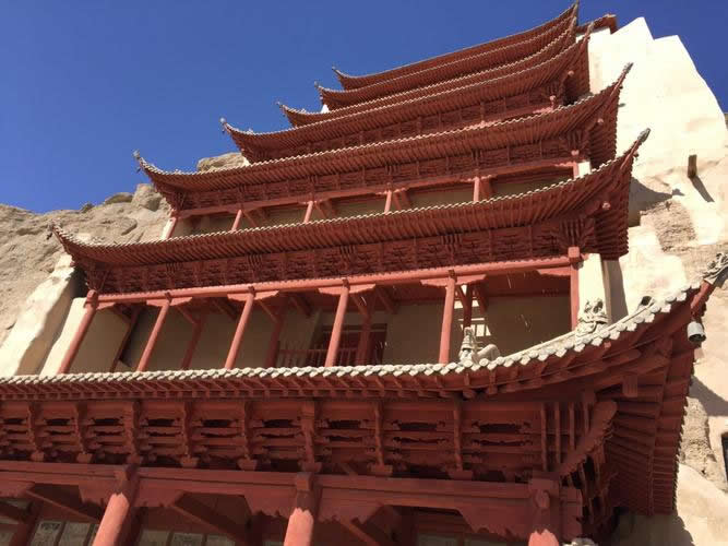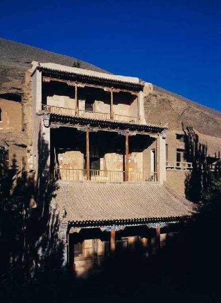 閣樓依崖就窟而起,下八層為五間六柱大型兩角窟檐,檐角上翹,有線脊,下垂風鐸(俗稱鐵馬)。第一層正對本窟巨型窟門,第四層和第七層各對洞窟明窗。第九層為八角頂,上豎3米高寶瓶,窟、像即以此頂相覆,三者共融一體。據(jù)P.2762《張淮深勛德記》及《宋乾德四年重修北大像記》、1936年《重修千佛洞九層樓碑記》(此碑已毀,僅存錄文)記載,武周初建大佛時,樓為四層。晚唐乾符年間(874—879),沙州歸義軍節(jié)度使張淮深重建,改四層為五層。宋乾德四年(966)沙州歸義軍節(jié)度使、托西大王曹元忠及其妻涼國夫人潯陽翟氏避暑莫高窟,將下兩層糟朽梁、柱拆換重建(上三層仍保存原建筑)。清光緒三十四年(1908),敦煌商民戴奉鈺集資重修,改五層為七層。1928年,劉驥德等合莫高窟住持喇嘛易昌恕等重建,改七層為九層,于1935年建成,即今之“九層樓”。
