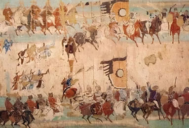 敦煌作為中西交通的樞紐,在壁畫上不僅留下了商旅來往的活動情況,還留下了寶貴的交通工具的形象資料。他們有牛馬駝騾、驢象舟船、車轎輿輦等。常用的交通工具車輛類型各異,牛車有“通牛車”、“偏牛車”、敞篷牛車,馬車有駟車、駱車,還有駱駝車、童車、獨輪車等,特別是保存了中國為世界交通做出獨有貢獻的獨輪車、馬套挽具(胸帶挽具和肩套挽具)、馬蹬、馬蹄釘掌等珍貴的圖像數(shù)據(jù)。西魏第285窟、北周第296窟五百盲賊皈依故事畫,表現(xiàn)了騎著戰(zhàn)馬的騎兵,與身穿褲褶的步兵(強盜)作戰(zhàn)的場面,畫面上畫出了馬鎧,它是保護戰(zhàn)馬的防護裝備,古稱具裝,或具裝鎧。第285窟馬鎧的形制齊全,從保護馬頭的“面簾”、到保護馬鞍后尻部的“寄生”一應俱全。反映了漢代已有的具裝,到北朝時期已發(fā)展為玩唄成熟的保護裝備。馬鎧的產(chǎn)生和發(fā)展是中國為世界軍事裝備所作的獨有貢獻。