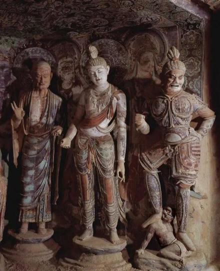 (1)早期——發(fā)展期,包括十六國、北魏、西魏、北周四個時代,歷時一百八十年。早期洞窟形制有三:1.禪窟,塑像在正龕。2.方形或長方形殿堂窟,塑像置于正龕或南北壁列龕內(nèi)。3.中心柱窟,塑像置于長方形柱四面之龕內(nèi)。從佛像類別上分,有彌勒像、釋迦像和釋迦多寶并坐像,以表現(xiàn)的事態(tài)分,有說法像、禪定像、思惟像。中心柱四面多為苦修、禪定、降魔、成道等像,主尊兩側多有侍從菩薩,形成一佛二菩薩的格式。早期彩塑多以彌勒為主尊,這與當時傳自西域的彌勒信仰有密切關系。