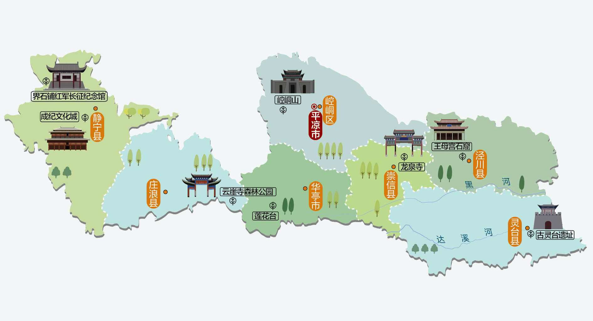 平?jīng)鍪休?個(gè)區(qū)、5個(gè)縣,代管1個(gè)縣級(jí)市: