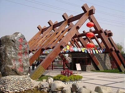 蘭州水車博覽園的南大門(正門)是一個造形獨特的木架結(jié)構(gòu)的大門,它寓意著兩個意思: