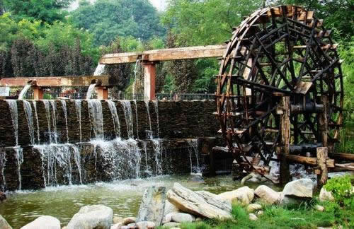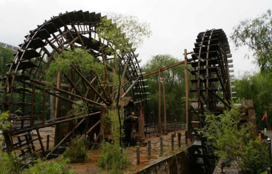 在水車廣場展現(xiàn)著各具特色的水車:在我們左側(cè)的是一架推水車(又稱水掛子),它依靠人力推動水車,將水提起,傾人水渠,灌溉農(nóng)田;在我們右側(cè)的是一架腳踏水車,其原理是用力踩動木輪,由傳動鏈條帶動水車,達到提水灌溉的目的;