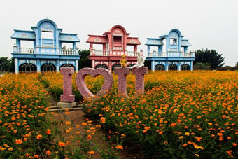 三座粉、藍相間的巨型迪斯尼風格門樓,一片橙色的仙女花在陽光恬靜地流敞著。七個巨型的氣球“串”綻放繽紛色彩,邊上還圍著精美的花柱。香格里拉,正如其名,有著一種永恒、和平、寧靜的 “世外桃源”。