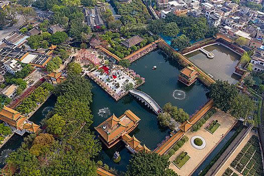 全園水景荔景灣、清平湖、寶墨湖與一千多米長河貫通,園中澄湖流水,綠沼長河,三十多座石橋橫跨旖旎河湖之上。紫洞舫弦歌裊裊,湖面上紫帶虹飛。園中陶塑、瓷塑、磚雕、灰塑、石刻、木雕等藝術(shù)精品琳瑯滿目,瓷塑浮雕《清明上河圖》已列入大世界基尼斯之最。聚家閣、寶墨藏珍、龍圖館、趙泰來藏品館等珍藏有古今名畫、書法、陶瓷、銅器、玉器等。園中遍植櫻花,春暖花開之時,櫻花也如期綻放。