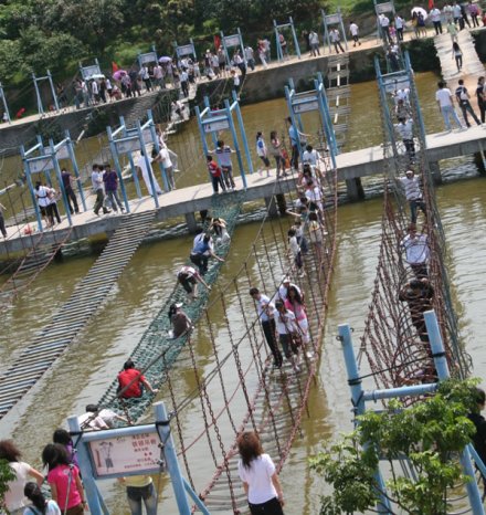 拓展訓(xùn)練基地占地面積10余畝,是深圳市青少年生存能力素質(zhì)教育基地,分為水上游樂區(qū)、高空拓展區(qū)與兒童游樂區(qū)。特別是水上游樂區(qū)涵蓋了霹靂滾桶、魔鬼車輪、木樁功夫橋和鐵鎖吊橋等有趣刺激拓展運(yùn)動(dòng)項(xiàng)目。您既可以在青山綠水中盡情呼吸新鮮空氣,又可以在動(dòng)感十足的拓展項(xiàng)目中挑戰(zhàn)自我,體驗(yàn)這一風(fēng)靡全球的拓展運(yùn)動(dòng)帶給你的無限快樂。項(xiàng)目網(wǎng)羅: 霹靂滾桶、魔鬼車輪、秋千橋 、連環(huán)獨(dú)木橋 、木樁功夫橋、 空中獨(dú)木橋、園木云梯橋、鐵鎖晃橋、長(zhǎng)板坡 、 云梯橋 、鐵鎖鋼絲橋 、天羅地網(wǎng)、云梯功夫橋 、鐵鎖吊橋、 木樁功夫橋、水上漂 、鐵鎖橋、 一線鐵鎖橋 一線鐵鎖橋 、九曲獨(dú)木橋 、踏水無痕 、向風(fēng)起舞 、鐵甲四強(qiáng)等。