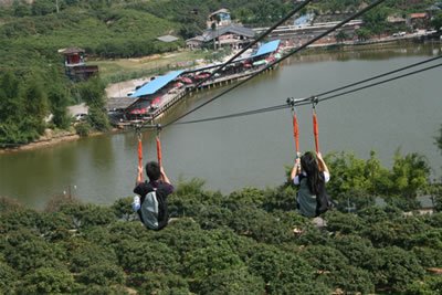 空中飛人滑索項(xiàng)目位于觀音廟后,依山勢(shì)而建,在果樹山林之間架起了一段全程300米、落差50米,每秒7.5米滑行速度的高空索道,在歷時(shí)40秒滑行時(shí)間中,游客在享受高空索道帶來驚險(xiǎn)刺激體驗(yàn)同時(shí),可一覽園區(qū)秀美風(fēng)景并,讓人回味無窮。