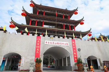 采用清代古城樓建筑風(fēng)格,飛檐翹角,氣勢(shì)恢宏,體現(xiàn)了中國(guó)古典建筑之美。內(nèi)設(shè)游客服務(wù)中心和售票處,是游客進(jìn)入觀(guān)音山景區(qū)所看到的第一道靚麗風(fēng)景。
