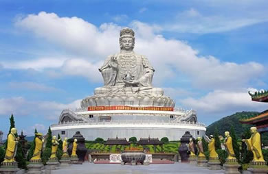 2001年4月,觀(guān)音廣場(chǎng)完工;6月,主體高33米、橫截面寬10.6米、重3300多噸,由999塊0.5-8噸的福建莆田優(yōu)質(zhì)玄武巖花崗石拼裝而成,全部工序均采用人工雕鑿并歷時(shí)3年的世界最大花崗巖觀(guān)音圣像完工。