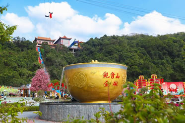 觀(guān)音山金碗滿(mǎn)溢金漆,光彩奪目,碗中有象征著“金銀”寶山,熠熠生輝,更有源源不斷流水滿(mǎn)碗而出,寓意著水滿(mǎn)財(cái)滿(mǎn),財(cái)源不斷,捧個(gè)“金飯碗”,賺得盆滿(mǎn)缽滿(mǎn)。