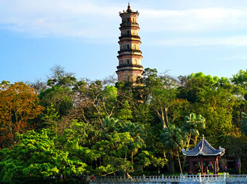 泗洲塔位于廣東惠州西湖西山,是湖上最古老建筑物。始建于唐中宗年間,為紀(jì)念泗洲大圣僧伽而筑,北宋文學(xué)家蘇軾謫居惠州時(shí)稱之為大圣塔。明嘉靖四十三年(1564年)塔毀,明萬歷初年改建亭,明萬歷四十六年(1618年)復(fù)建塔。光緒初年,雷破塔頂一角,長了一株榕樹,清代愛國詩人丘逢甲詩云:“行人欲問朝云墓,看取亭亭塔頂榕”。山上綠樹成蔭,亭廊排映,景色秀麗。蘇東坡寫的《江月五首》“一更山吐月,玉塔臥微瀾”的著名詩句指的正是此塔。泗洲塔明代后建至今,已有整整403年古老歷史,是惠州現(xiàn)保存最完善古老的珍貴建筑物之一。惠州泗洲塔被廣東省人民政府批準(zhǔn)并公布為第八批廣東省文物保護(hù)單位。