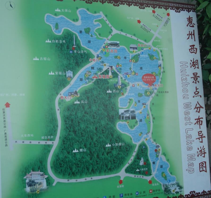 宋朝時(shí),惠州西湖就有“五湖六橋八景”之說。 五湖分別是平湖、豐湖、南湖、鱷湖、菱湖。20世紀(jì)90年代,政府把紅花湖與這五湖貫通,形成一體,增稱為六湖。古六橋分別是西新橋、拱北橋、圓通橋、明圣橋、煙霞橋、迎仙橋。新中國建國前后,又建設(shè)了眾多景觀橋,其中九曲橋、枇杷橋、花洲橋以其新姿特色點(diǎn)綴西湖,和古景六橋一起被并稱為當(dāng)代西湖九橋;八景是前人對當(dāng)?shù)厝宋牡乩淼囊环N歸納和彰揚(yáng):“豐湖晚唱、半徑樵歸、山寺嵐煙、水簾飛瀑、荔浦風(fēng)清、桃園日暖、鶴峰返照、雁塔斜暉”稱為古八景。其中有自然景觀,也有人文景觀。隨著時(shí)境變遷,西湖建設(shè)不斷完善,后來又有了“十二景”、“十六景”、“二十四景”之說,現(xiàn)有景點(diǎn)28處,其中名景有18處。今天,惠州西湖已有“六湖九橋十八景”之說。