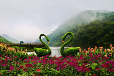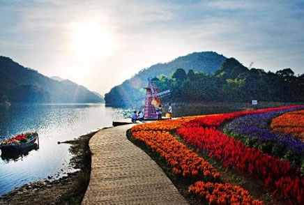 “七彩天池”花海是石灶風(fēng)光區(qū)的天池花海景點國慶期間的一個特色,由多種顏色的花卉共同組成。大紅色的一串紅、金黃色的硫化菊、紫色的千日紅、橙色的百日草、深紅色的紅穗冠、淡黃色的黃穗冠和粉色的朱唇等匯聚成一道亮麗的彩虹,降落在藍(lán)天碧水之間,創(chuàng)造出一個七彩斑斕的童話世界。同時,圍繞著這七色花海還有大波斯菊與醉蝶花。紅的,粉的,紫的,白的小花配以音樂等元素造型共同點綴著這幅優(yōu)美的畫卷!捌卟侍斐亍弊罴延^賞期為9-11月。
