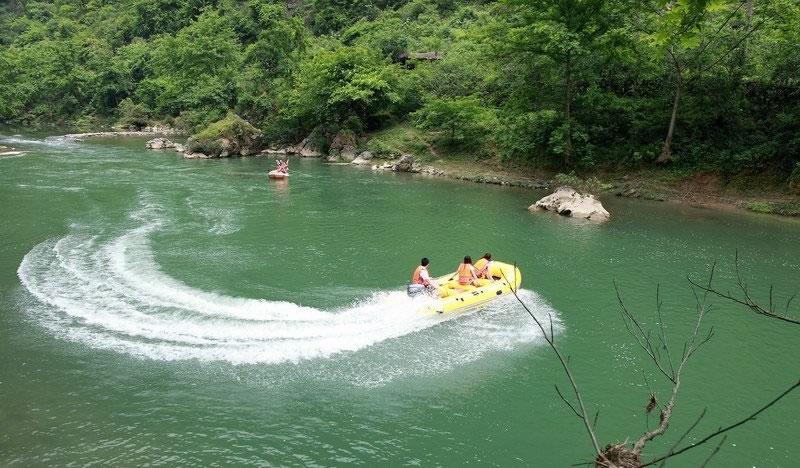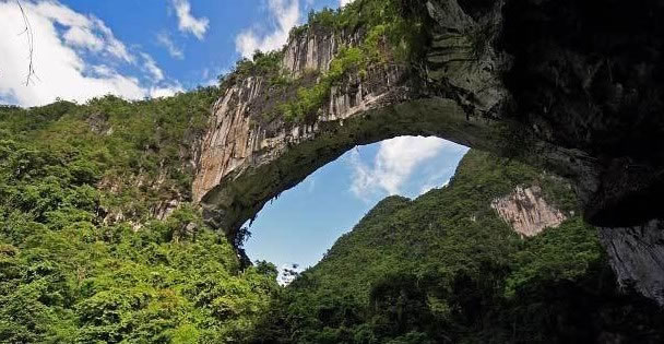 布柳河仙人橋景區(qū),地處樂(lè)業(yè)縣新化鎮(zhèn)磨里村布柳河大峽谷,距縣城51公里,該峽谷全長(zhǎng)16.9公里。沿河兩岸綠樹(shù)成蔭,有“植物的王國(guó),鳥(niǎo)類(lèi)的天堂”之美稱(chēng),河里魚(yú)兒穿梭,既可漂流,又可觀(guān)光旅游。布柳河上還有一座由三座大山塌陷形成的天然石拱橋,坐落于漂流河段下游,當(dāng)?shù)厝朔Q(chēng)為“仙人橋”。仙人橋拱孔跨度177.14米,橋?qū)?9.3米,橋身長(zhǎng)280米,橋身厚78米,總橋高165米,拱高87米。
