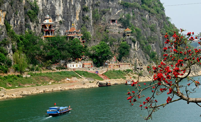 金雞巖位于縣城西北隅,坐落在架山腰間,瀕臨左江,與扶綏中學(xué)隔江相望。 [22]主洞面積40多平方米,高4米、內(nèi)設(shè)有金雞娘娘、斑民夫人、花公、花婆、花木蘭等塑像。洞口左側(cè)有伏波亭,右側(cè)有伏波將軍塑像。沿江岸有103級(jí)石階通往洞口。金雞巖為明代遺址。相傳金雞娘娘于此修道成正果,故名“金雞巖”。明代著名地理學(xué)家、旅行家徐霞客留下“三誤三返”游跡;清代名人劉宅俊在懸崖巖壁上刻鐫著“雞巖帆影”題詞;道光癸卯年記載著李佑會(huì)題刻銘詩(shī)。