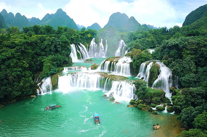 德天跨國瀑布位于祖國西南邊陲——廣西崇左市大新縣,開門是越南,跨步進東盟,是2015年11月中越兩國總書記見證簽約的中國首個跨境旅游合作區(qū)。距廣西首府南寧約196公里,距大新縣57公里,距紅色革命老區(qū)百色188公里,奇特的喀斯特地貌和自然山水風(fēng)光,被稱為中越邊境的百里山水畫廊。景區(qū)占地面積約5.75平方公里,橫跨中越兩國,形成中國的德天瀑布,越南的板約瀑布。因景觀獨特被譽為亞洲第一大跨國瀑布、中國最美的六大瀑布。 德天跨國瀑布于1992年對外開放,2018年榮膺國家5A級旅游景區(qū),中越兩國以德天瀑布至碩龍鎮(zhèn)14.5公里的歸春河為天然國界,歸春河發(fā)源于廣西靖西縣鵝泉,全長150公里,途經(jīng)越南,迂回35公里后又復(fù)入碩龍鎮(zhèn)德天村,“歸國遇春”便是當(dāng)?shù)卮迕褓x于它的美好寓意。歸春河經(jīng)大新縣德天村處被峙在江心的浦湯島所阻擋,使河水激石咆哮,奪路而下,遇斷崖跌落而形成高低落差不同的三級疊瀑。瀑布橫跨中、越兩國,寬約200米,縱深60米,落差達70米,層層跌落,水勢激蕩,氣勢磅礴,是東南亞最大的天然瀑布,年均徑流量達每秒55.2立方米,約為貴州黃果樹瀑布的三倍,被稱之為“天然氧吧”。