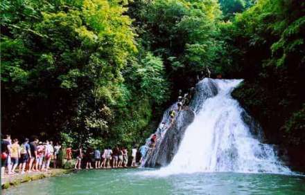 瀑布源頭比漓江水面高出180米,是我國唯一一個由地下涌泉形成的多級串連瀑布;是一個因鈣華沉積作用可逐漸長高而改變景致的瀑布。八級瀑布形態(tài)各異,有的如鴛鴦戲水,有的如蛟龍噴水,有的懸于長滿青苔的巖壁上,瀑水如布,水紋清晰可鑒,呈白色透明狀,猶如噴霧行云;有的水流集中下注跌入深潭濺起層層水霧浪花,猶如細雨蒙蒙,瀑布兩岸林木蔥郁,蔭蔽幽靜,水質(zhì)清洌,涼爽甘甜。山腳亞熱帶雨林濃郁,藤蔓垂壁,叢林險徑,三千多畝的楓樹和馬尾松,風(fēng)吹林動,鳥語花香,令人有回歸自然的親切感。到了深秋時節(jié)的紅楓更是別一番“霜林盡染,漫山紅遍,紅葉鋪滿山徑”的美景。