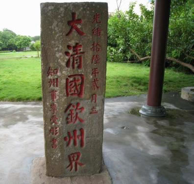 大清國(guó)一號(hào)界碑位于北侖河出?诘男∩狡律,碑高1.7米,寬0.7米,厚0.4米,用沿海所產(chǎn)的海蝕巖鑿成。界碑正面書“大清國(guó)欽州界·知州李受彤書·光緒十六年二月立”,涂著紅漆的莊嚴(yán)雄渾的大楷碑文透著一股不可侵犯的凜然正氣。這塊飽受長(zhǎng)年風(fēng)吹日曬雨淋而益顯滄桑的巨石,一直昂揚(yáng)地巍然屹立著,向每一個(gè)游客訴說(shuō)著100多年來(lái)的每一段歷史。