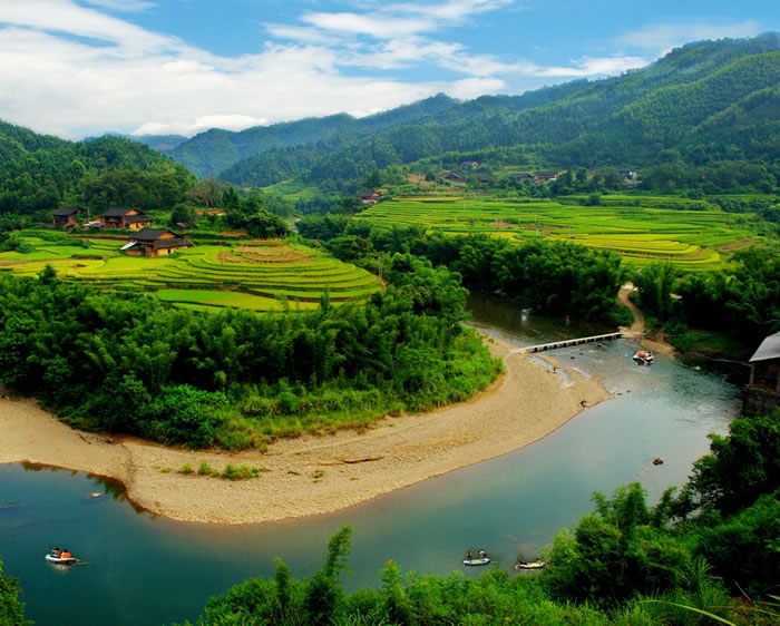 大洲生態(tài)農(nóng)業(yè)旅游區(qū),2005年12月由國(guó)家旅游局命名為"全國(guó)農(nóng)業(yè)旅游示范點(diǎn)"。位于融安縣長(zhǎng)安鎮(zhèn)大洲村,與縣城僅一水之隔,面積約2.2平方千米。大洲四面環(huán)水、島上竹林成片、綠樹成蔭、瓜果飄香,如一顆明珠鑲嵌在融江中。洲上地勢(shì)平坦,土壤肥沃,耕地面積700畝,素以農(nóng)業(yè)為主,是縣城的無(wú)公害蔬菜生產(chǎn)基地,其中以大洲頭菜、蘿卜、涼薯等土特產(chǎn)名揚(yáng)區(qū)內(nèi)外。洲上樹木蔥郁,古木參天,農(nóng)舍掩映,田園風(fēng)光優(yōu)美,兩岸翠竹連綿,岸邊百畝天然草坪與清澈寬闊的江水組成一幅美麗的畫面。景區(qū)修建了2000多米環(huán)洲游覽步道、小廣場(chǎng)、游客中心、碼頭、涼亭等一批公共設(shè)施,開放大洲浮橋、千年古榕、三友亭、瓜果長(zhǎng)廊、無(wú)公害頭菜示范園、柚子園、樟樹王等10個(gè)景點(diǎn)。是集農(nóng)業(yè)觀光、休閑度假、無(wú)公害農(nóng)產(chǎn)品生產(chǎn)、教育、培訓(xùn)為一體的農(nóng)業(yè)旅游園區(qū)。