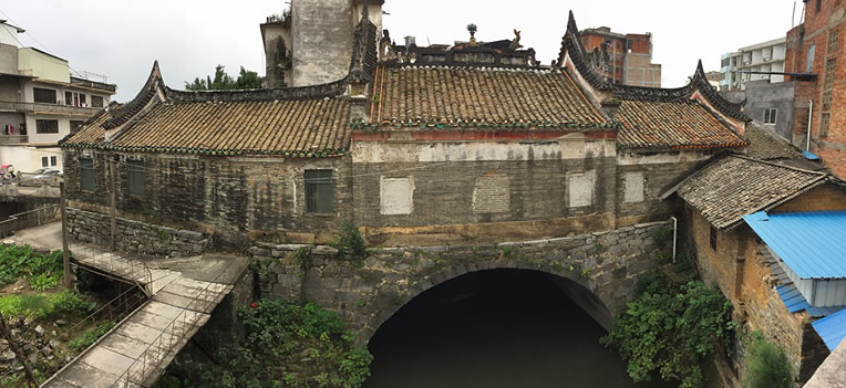 登龍橋在西河流向圭江的入口處。據(jù)資料記載,該橋始建于宋元年,全長36.3米,拱跨10米,高5.5米,寬13.5米。橋面一邊為橋的通道,中間建風(fēng)雨亭,為歇山頂磚木結(jié)構(gòu);一邊建殿堂,青磚砌墻,青瓦覆蓋,硬山頂磚木結(jié)構(gòu)。頂部磚砌灰雕花脊,兩端飾鰲魚,中間為火球。殿內(nèi)墻端繪飾古壁畫,園木柱作頂柱。橋東牌坊上刻著“登龍橋”三個(gè)大字,整座建筑風(fēng)格獨(dú)特,莊重樸實(shí)。為北流八景之“龍橋夜月”所在。