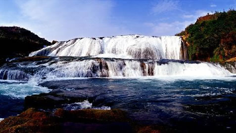 平水時,白水河流量不大,水流清澈,瀑布水層沿著和緩的瀑面,均勻地撒開,如一層薄薄的、半透明的面紗,又如一面面張開的素絹扇面,在陽光下泛著銀光,故有人戲稱為“新娘面紗”。但當(dāng)洪季來臨,白水河中由于攜帶了大量山洪沖下來的泥沙而呈土黃色,陡坡塘瀑布便消失了往日平水時的秀色,而變得異常兇猛雄壯。